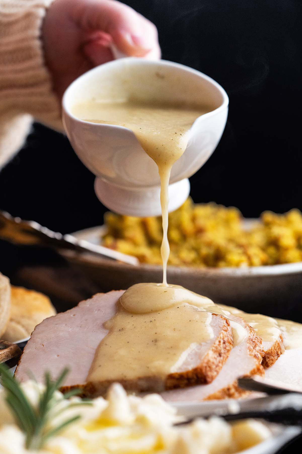 Whisk in the chicken stock, and then the onion powder, garlic powder, salt, black pepper, and poultry seasoning.